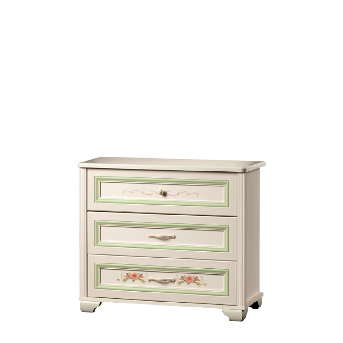 Золотистые ручки с белой патиной подчеркивают классический стиль мебели